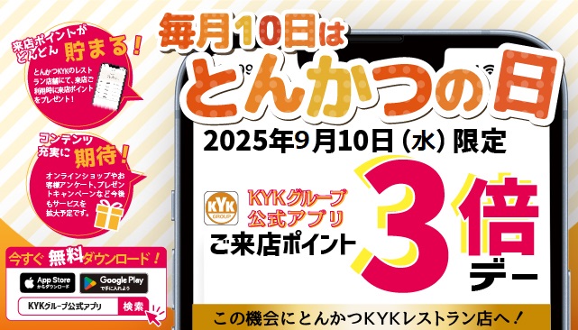 2025年9月10日(水)は、とんかつKYKグループ公式アプリの来店ポイントが通常「10ポイント」のところ3倍の「30ポイント」をプレゼントいたします!