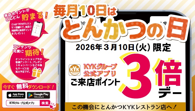 とんかつKYKグループ公式アプリの来店ポイントが、通常「10ポイント」のところ、3倍の「30ポイント」をプレゼント致します。