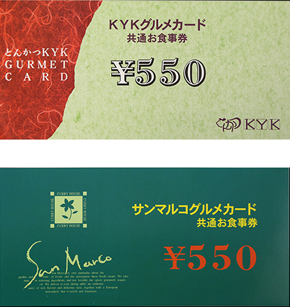 「KYKグルメカード共通お食事券」と「サンマルコグルメカード共通お食事券」(旧お食事券)は、2021年8月31日をもちまして新規販売を終了致しました。