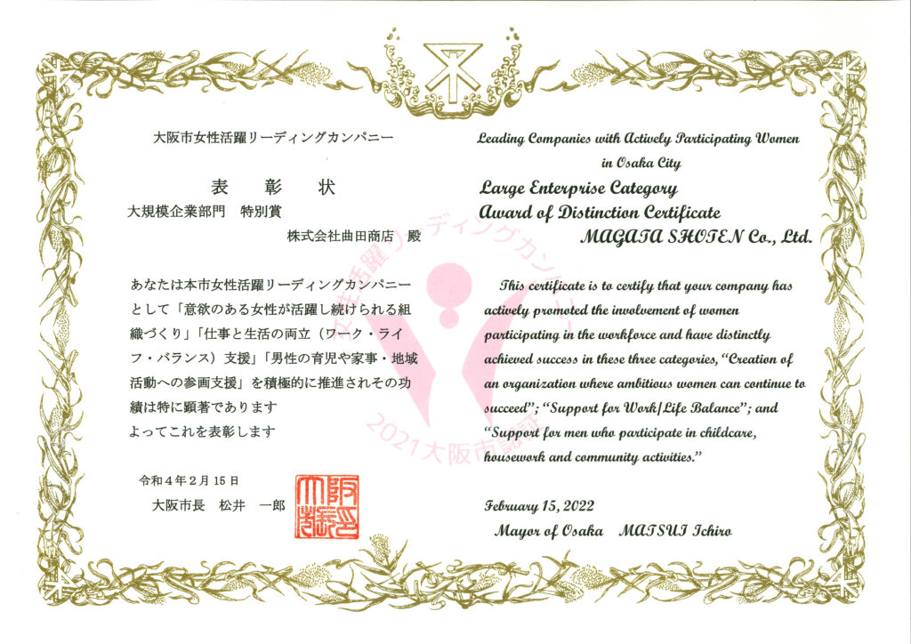 当社は、2022年2月15日に大阪市庁舎で開催された「令和3年度大阪市女性活躍リーディングカンパニー」市長表彰式において、「特別賞」を受賞いたしました!