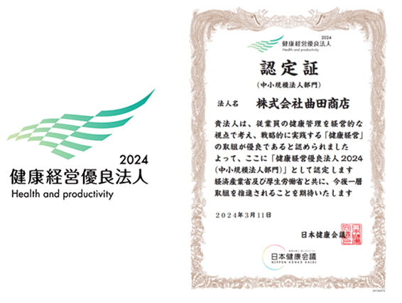 2024年3月11日 経済産業省と日本健康会議が共同で行っている「健康経営優良法人2024」にエントリーし、株式会社曲田商店が「健康経営優良法人2024(中小規模法人部)」に認定されました。